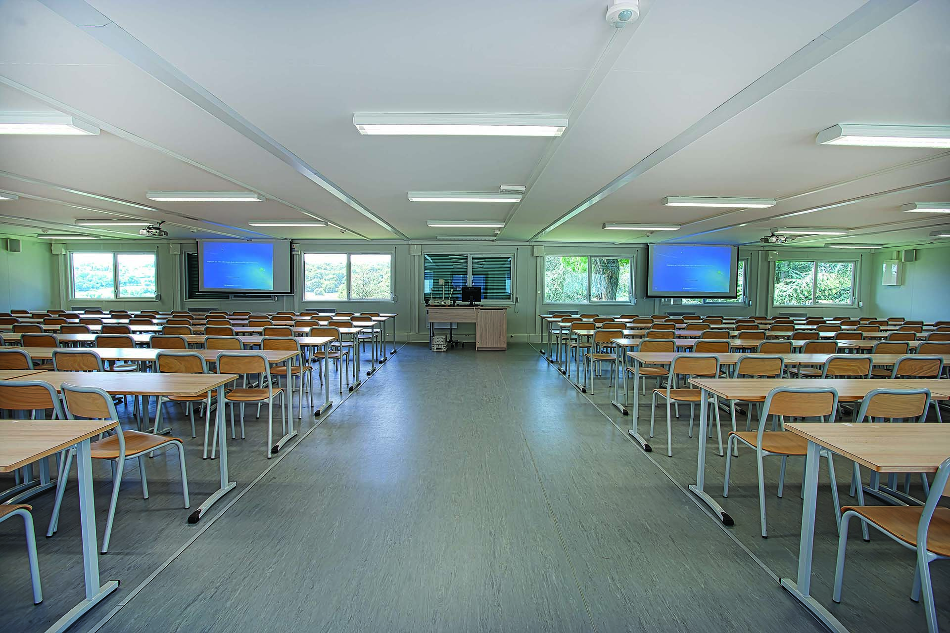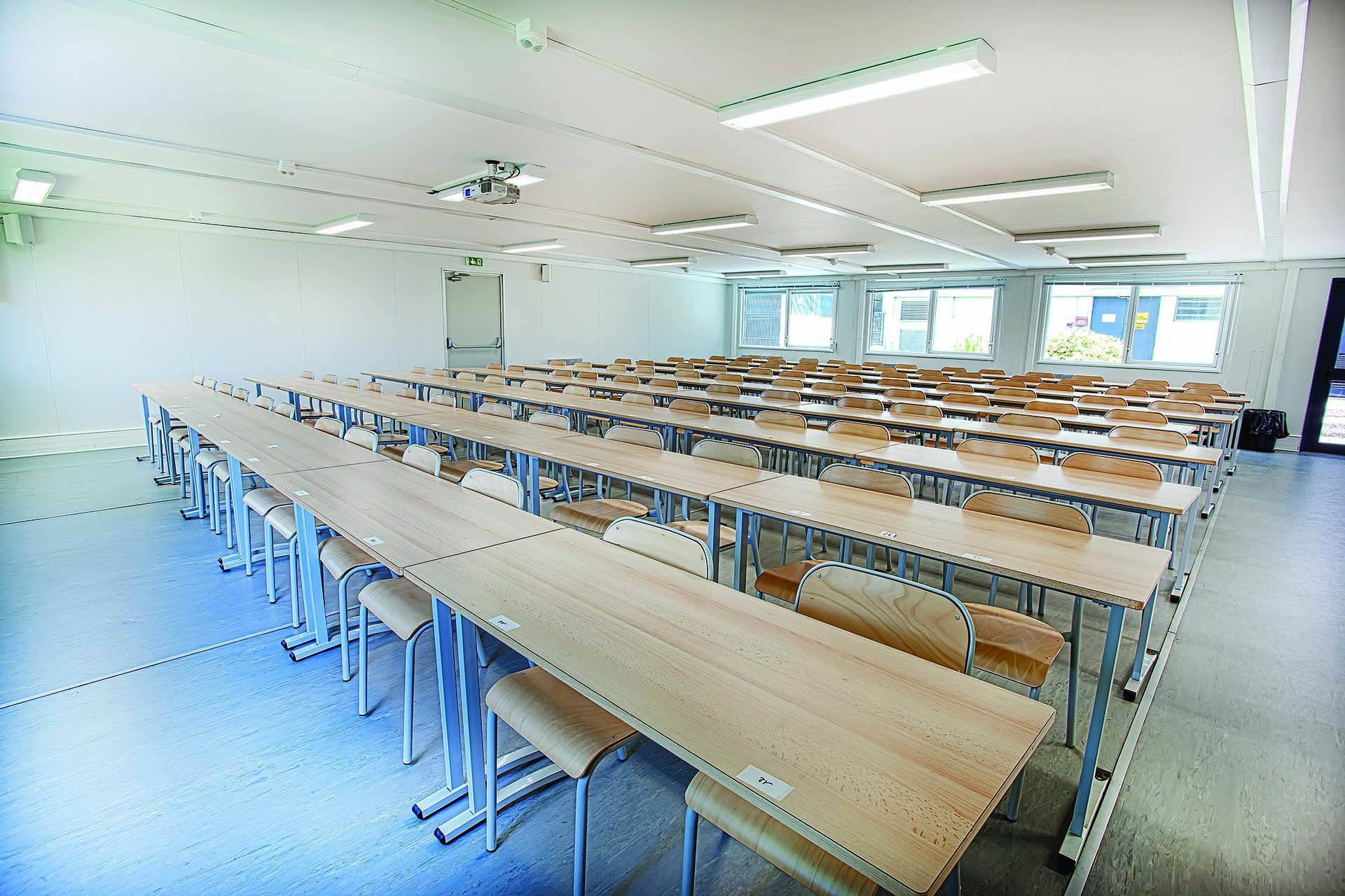 Le problème est complexe : il s’agit de remplacer provisoirement un amphithéâtre où deux cents étudiants suivent des cours en visioconférence. Des trois prestataires interrogés, seule la société Portakabin est capable d’apporter une solution satisfaisante. Il leur fallait une salle d’une très grande surface sans aucun poteau de soutien afin que chaque étudiant voie parfaitement l’un des écrans de projection audio-visuel.