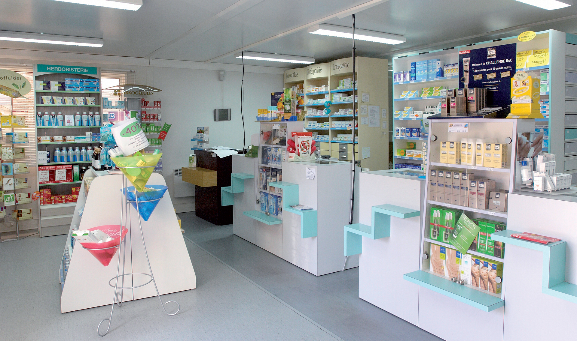 5 jours seulement après la signature, une surface de 110 m² était mise en place sur le parking de la pharmacie. Les bâtiments modulaires ont été aménagés comme une officine traditionnelle avec ses réserves et son espace parapharmacie immédiatement opérationnels, qui aura permi d'accueillir les clients dès le début des travaux.