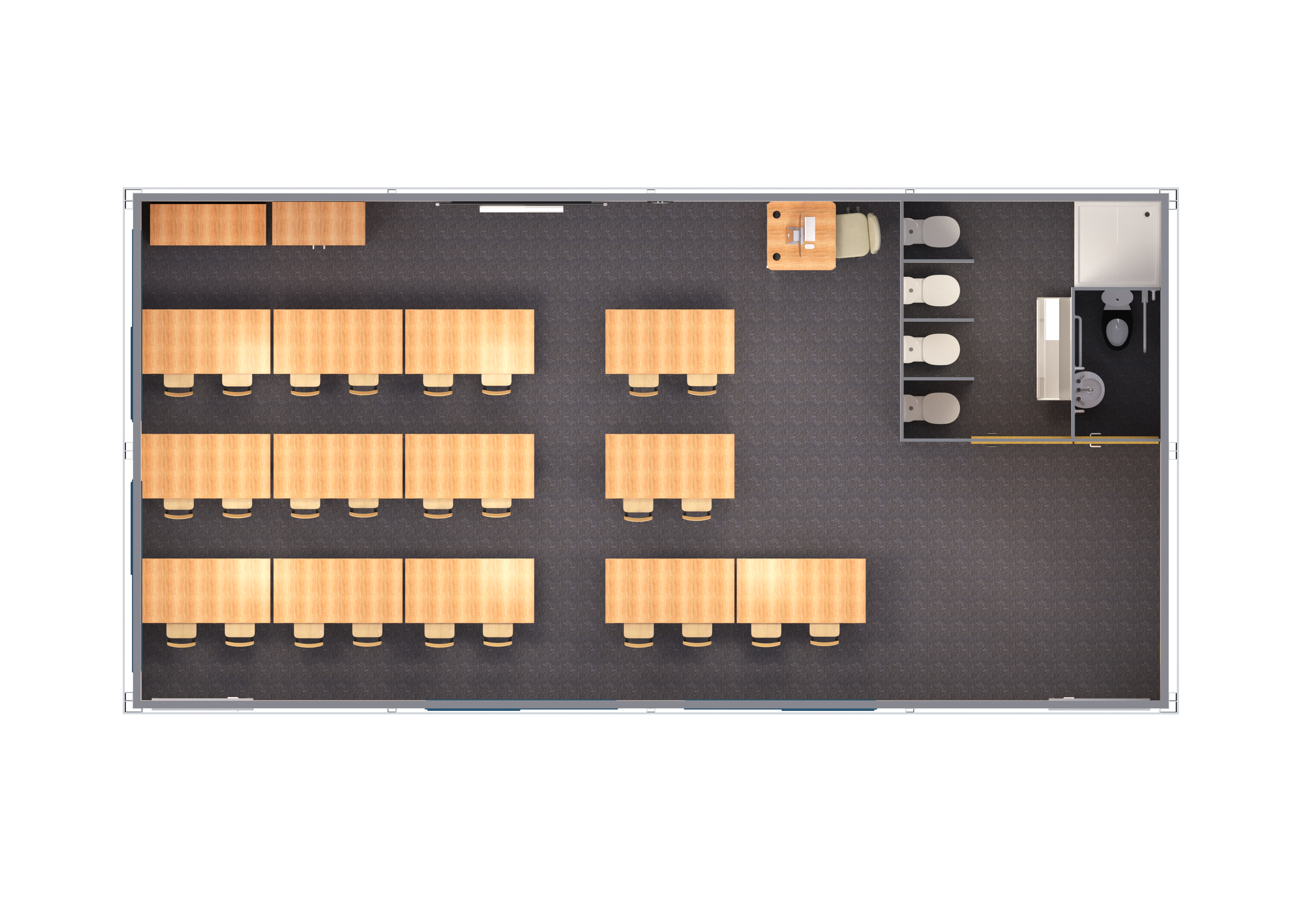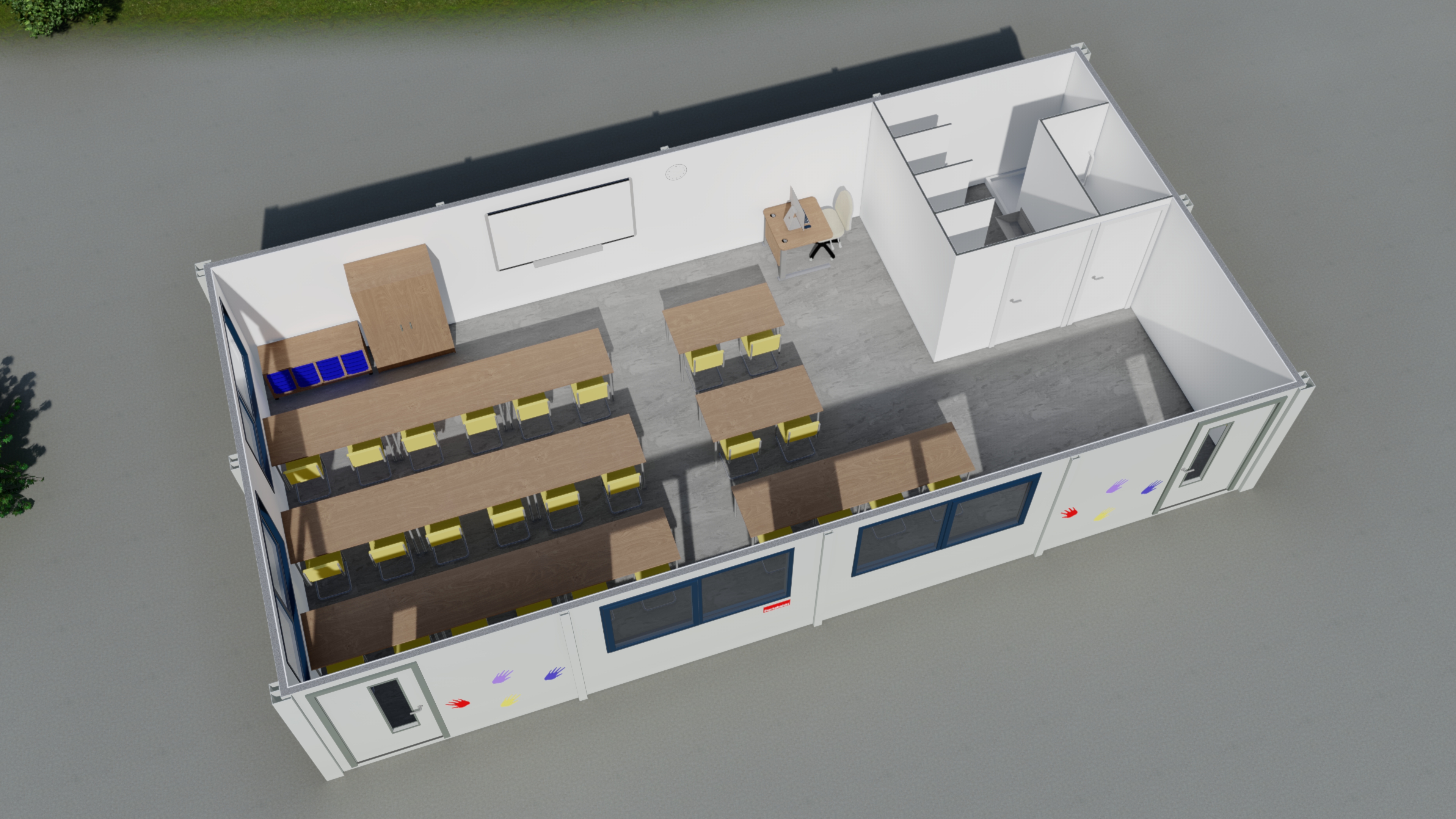 Conformément aux recommandations du système éducatif national, votre salle de classe est baignée de lumière naturelle, opérationnelle en un jour et disponible dans la taille Maternelle (55 m2) ou Primaire (70 m2).