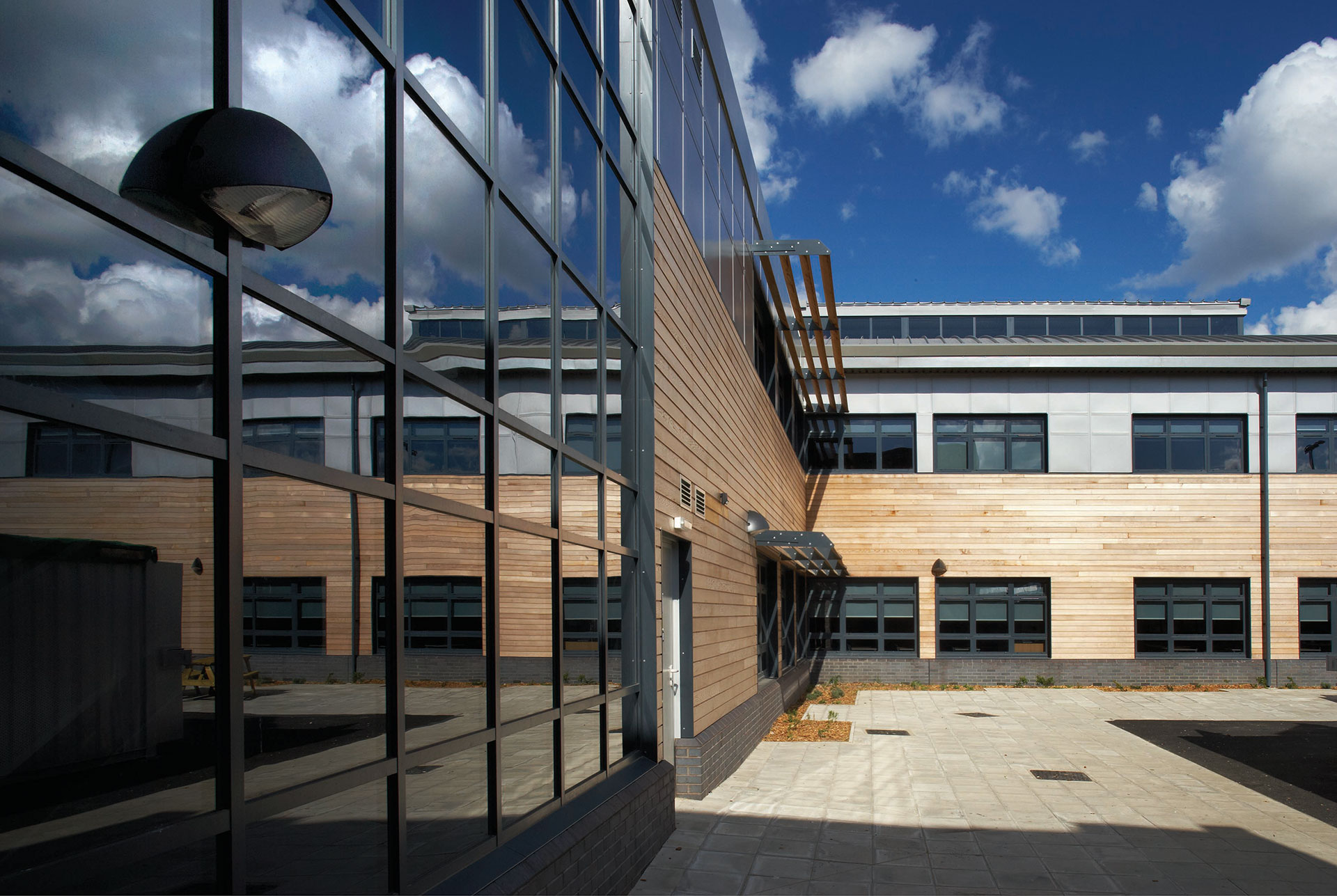 Architectural features include a barrel-vaulted roof with central light wells, an impressive oversailing entrance canopy roof and a range of external claddings, with metal rainscreen panels to the upper floor.