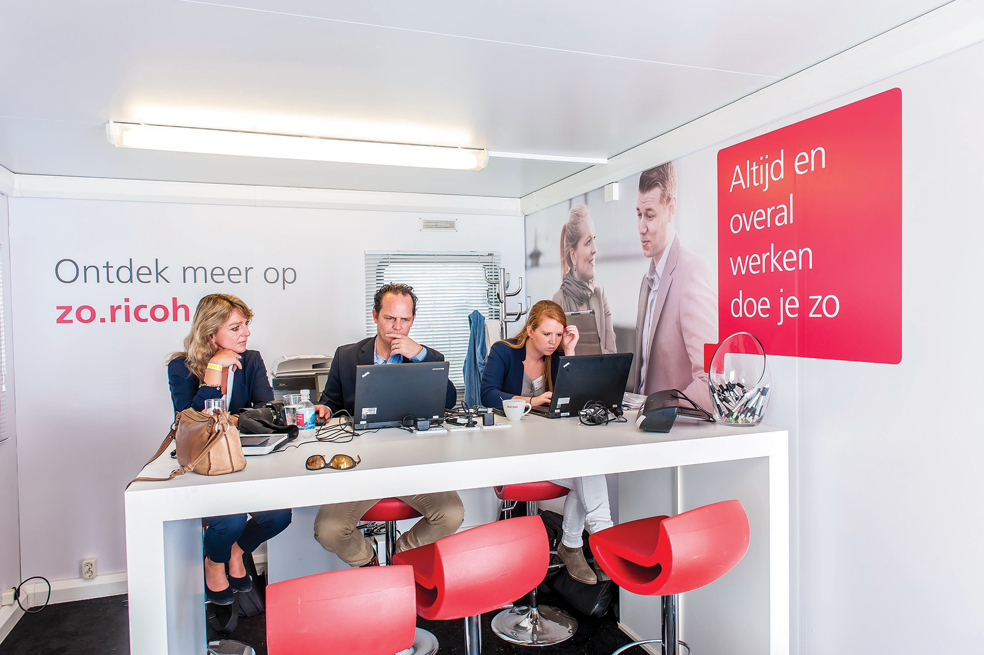 Om het bedrijf Ricoh te promoten op een drietal gerenommeerde tennis evenementen was een verplaatsbaar gebouw nodig dat van binnen en buiten in de huisstijl van Ricoh kon worden gehuld. Een tweetal evenementen vindt plaats in de buitenlucht, het gebouw moest hier tegen bestemd zijn. Om klanten te ontvangen in het pop-up kantoor moest er een mooie indeling van het gebouw zijn met een ingebouwd toilet en keukentje.